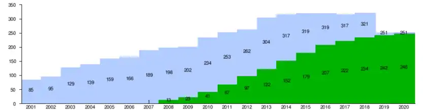 | ۲۰۰۱ | ۲۰۰۲ | ۲۰۰۳ | ۲۰۰۴ | ۲۰۰۵ | ۲۰۰۶ | ۲۰۰۷ | ۲۰۰۸ | ۲۰۰۹ | ۲۰۱۰ | ۲۰۱۱ | ۲۰۱۲ | ۲۰۱۳ | ۲۰۱۴ | ۲۰۱۵ | ۲۰۱۶ | ۲۰۱۷ | ۲۰۱۸ | ۲۰۱۹ | ۲۰۲۰ | مجموع | ||