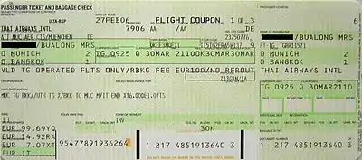 یک بلیط خطوط هوایی که کد ایزو ۴۲۱۷ آن به صورت EUR است. نه نشان یورو (پایین چپ)