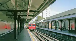 - Eastbound platform, 1972. The branch track to Lillie Bridge depot is just visible at the end of the platform.