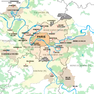 پاریس،[1] اسون[2] او-دو-سن،[3] سن-سن-دنی،[4] سنه مرن،[5] ول دو مرن،[6] وال دواز،[7] ایولین[8] |