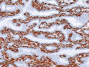 رنگآمیزی با استفاده از پادتن بر ضد اکتین در پاپیلوم داخل مجرایی پستان-سلولهای قهوهای رنگ.
