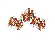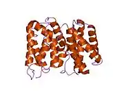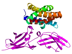![]() ساختار کریستالوگرافی IL-22 (رنگبندی، پایانه-N = آبی، پایانه-C = قرمز) کمپلکس با IL-22R1 (سرخابی).[1] | |||||||||||||