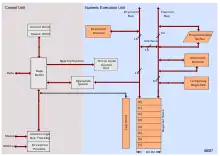 خانوادهٔ x87 از سری ثباتهای قابل آدرسدهی مانند ثباتهای اصلی پردازندههای x86 بهطور مستقیم استفاده نمیکنند؛ جای آن، ثباتهای x87 یک ساختار پشتهای[13] با ۸ سطح عمق که از st0 تا st7 سطحبندی میشوند، تشکیل میدهند. st0 بر روی پشته قرار دارد. عملیاتهای دستورالعملهای x87 با push کردن، محاسبه، و pop کردن مقادیر روی این پشته اجرا میشوند. اگرچه عملیاتهای دوتایی مثل FADD , FMUL ,FCMP و غیره ممکن است ضمناً از st0 و st1 یا st0 با یک حافظه یا یک ثبات بهطور غیر ضمنی استفاده کند؛ ثبات st0 میتواند به عنوان جمعکننده () استفاده شود و همچنین میتواند با هر یک از ۸ ثبات پشته از طریق فراخوانی دستورالعمل FXCH stX (کدهای D9C8..D9CFh) جابهجا شود. این موجب میشود که پشته x87 قابل استفاده به عنوان ۷ ثبات آزاد قابل آدرسدهی به علاوه یک جمعکننده شود. این مخصوصاً کارآمد بر روی پردازندههای x86 superescalar (پنتیوم ۱۹۹۳ و بعد از آن) است جایی که دستورالعمل تعویض به خطای صفر کلاک بهینهسازی شدهاند.