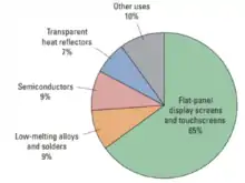 عمده کاربرد ایندیوم در ساخت لایههای نازکی است که از آنها بهعنوان لایههای روغنکاری شده استفاده میشود. بیشترین مقدار ایندیوم مصرف شده مربوط به تولید جهانی LCD است.