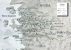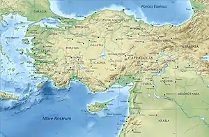 ![]() آسیای صغیر/آناتولی در دوران رومی یونانی، مناطق قدیمی وشهرکهای اصلی از جمله ایونیه. | |