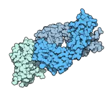 | Fab fragment of ipilimumab (blue) binding CTLA-4 (green). From PDB entry 5TRU. | |