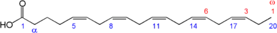 سه اسید چرب تشکیلدهنده خانواده امگا-3 عبارتند ازآلفا-لینولنیک اسید (ALA)، ایکوساپنتائنوئیک اسید(EPA) و دوکوزاهگزائنوئیک اسید(DHA). آلفا- لینولنیک اسید (ALA) در گردو و برخی از انواع گیاهان یافت میشود. دو اسید چرب دیگر، یعنی ایکوساپنتائنوئیک اسید (EPA) ودوکوزاهگزائنوئیک اسید (DHA) در ماهی همچون سالمون و از جمله در روغن و مکملهای ماهی وجود دارد. اسیدهای چرب n-۳(کربن سوم سیر نشده)، که از نظر تغذیهای بسیار مهمند آلفا-لینولنیک اسید(ALA)، دوکوساهگزانوییک اسید (DHA) و ایکوساپنتانوییک اسید (EPA) میباشند که همگی دارای غیراشباعیت چندگانه هستند. بدن انسان توانایی ساختن و سنتز کردن اسیدهای چرب n-۳ را از مولکولهای دیگر ندارد، اما میتواند زنجیره بلند ۲۰و۲۲ کربنی اسیدهای چرب n-۳ سیرنشده مانند EPA و DHA را از زنجیره کوتاه هشت کربنی ALA تشکیل دهد.