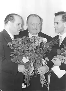 ![]() ایگور اویستراخ (سمت راست) در کنار رهبر ارکستر فرانتس کنویچنی (وسط) و پدرش داوید اویستراخ (سمت چپ) در سال ۱۹۵۷ میلادی | |