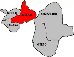 شهرستان باباتی از شمال با استان آروشا و از جنوب شرقی با شهرستان سیمانجیرو و از جنوب با استان دودوما و از جنوب غربی با شهرستان هانانگ و از شمال غربی با شهرستان امبولو هممرز میباشد.