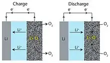 کاتد در هنگام شارژ در کاتد، اکسیژن از طریق کاهش الکترون را به لیتیوم اهدا می کند. از کربن مزوپور به عنوان یک بستر کاتدی با کاتالیزورهای فلزی استفاده شده است که باعث افزایش سینتیک کاهش و افزایش ظرفیت خاص کاتد می شود. منگنز، کبالت، روتنیوم، پلاتین، نقره یا مخلوطی از کبالت و منگنز از کاتالیزورهای فلزی بالقوه هستند. تحت برخی شرایط کاتدهای کاتالیز شده منگنز بهترین عملکرد را داشتند، با ظرفیت خاص 3137 mA·H/g و کاتدهای کاتالیز شده با کبالت با بهترین ظرفیت 2414 mA·H/g دومین بهترین ها را داشتند. بر اساس اولین مدل سازی مقیاس منافذ باتری های لیتیوم - هوا، ساختار ریز کاتد به طور قابل توجهی بر ظرفیت باتری هم در رژیم های غیر مسدود کننده منفذ و هم در منافذ منفذ تأثیر می گذارد. بیشتر محدودیت های باتری Li-air در کاتد است که منبع مزایای بالقوه آن نیز می باشد. اکسیژن اتمسفر باید در کاتد وجود داشته باشد، اما آلودگی هایی مانند بخار آب می تواند به آن آسیب برساند. تخلیه ناقص به دلیل انسداد کاتد کربن متخلخل با محصولات تخلیه مانند پراکسید لیتیوم (در طرح های غیر عادی) جدی ترین است. کاتالیزورها در ایجاد هسته ترجیحی Li2O2 بیش از Li2Oترجیح داده شده اند ،که با توجه به لیتیوم برگشت پذیر نیست. عملکرد Li–air با کارایی واکنش در کاتد محدود می شود، زیرا بیشتر افت ولتاژ در آنجا اتفاق می افتد. چندین ترکیب شیمیایی مورد ارزیابی قرار گرفته است که توسط الکترولیت آنها متمایز شده است. این بحث بر روی الکترولیت های آلی و آبی متمرکز است زیرا الکتروشیمی حالت جامد به خوبی درک نشده است.