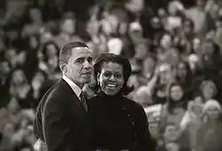 باراک اوباما به عنوان اولین سیاهپوست در تاریخ کشور آمریکا که در پی یک مبارزه انتخاباتی طولانی بر رقیبش هیلاری کلینتون پیروز شده بود نماینده حزب دموکرات در انتخابات سال ۲۰۰۹ انتخاب گردید.[45] سرانجام در تاریخ ۷ ژوئن سال ۲۰۰۸ تنها رقیبش هیلاری کلینتون از رقابت دست کشید و گفت بهطور کامل از آقای اوباما حمایت میکنم.[46]