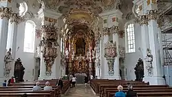 ![]() ![]() ![]() Top: Venus and Adonis by پیتر پل روبنس (1635–40); Centre: The Ecstasy of Saint Teresa by جان لورنتسو برنینی (1651); Bottom: The Wieskirche in Bavaria (1754) | |