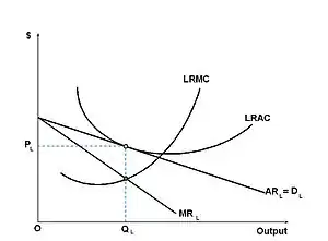 - بنگاهها در بازار رقابت کامل در مقیاس کارآمد تولید میکنند به نحوی که هزینهٔ متوسط کل (ATC) حداقل میشود. برعکس، بنگاهها در بازار رقابت انحصاری در سطحی کمتر از مقیاس کارآمد تولید میکنند.