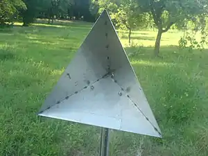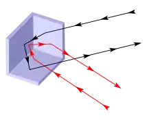 پرتو ورودی سه بار منعکس شده، هر بار با یک سطح که باعث عکس شدن جهت میشود.[1][2]