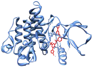ساختمان کریستالی داروی جدی «نیلوتینیب» (قرمز) در ترکیب با دومِـین Abl کیناز (آبی). این دارو در درمان لوسمی مزمن مغز استخوان کاربرد دارد.