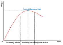 نمودار بازده نزولی که در آن سه ناحیهٔ بازده افزایشی، بیشینهٔ بازده، و کاهش بازده نشان داده شدهاند.