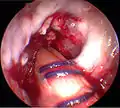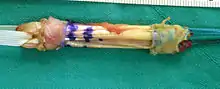 ![]() آرتروسکوپی رباط صلیبی قدامی جهت بازسازی مجدد در زانوی سمت راست پس از پایان جراحی بازسازی رباط آسیب دیده نشان داده شدهاست. ۱- تاندون[پ 1] ماهیچه سمیتندنیوس[پ 2] که چندلا شده و با ضخامتی مناسب به سمت بالا کشیده شدهاست. ۲- اتوگرافت[پ 3] از جلوی رباط متقاطع پشتی[پ 4] به سمت بالا کشیده شدهاست. ۳- رباط[پ 5] تازه که از مسیر قبلی رباط آسیبدیده عبور کرده و جایگزین آن شدهاست. | |