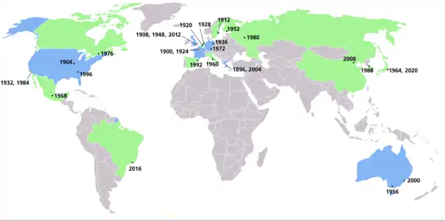 اولین دوره مسابقات المپیک در سال ۱۸۹۶ در شهر آتن پایتخت کشور یونان گشایش یافته، آخرین دوره بازیهای المپیک در ریو دو ژانیرو برگزار شده، دوره بعدی مسابقات نیز در توکیو و در سال ۲۰۲۰ میلادی برگزار میشود.