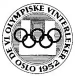 ![]() The emblem is the New Oslo City Hall overlaid by the Olympic rings, and surrounded by the phrase, "The 6th Winter Olympic Games / Oslo 1952". | |