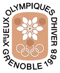 ![]() The emblem represents a snow crystal and three red roses, the symbol of Grenoble, and the Olympic rings. | |