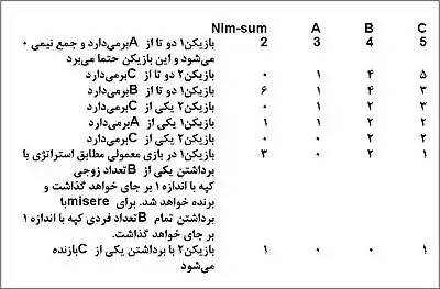 | ۲ | ۱ | ۰ | بازیکن یک ۱ سنگ ریز از C بر میدارد. (در misere تمام C را بر میداشت وپیروز میشد) |