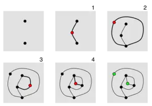 - نقطهٔ جدید نباید روی یکی از نقطههای انتهایی خط جدید قرار داده شود. بنابراین هر نقطهٔ جدید خط را به دو پارهخط کوتاه تقسیم میکند.