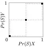 تعادل نش خالص، نقطههایی در گوشههای پایین سمت چپ و بالا سمت راست از فضای راهبردی هستند، در حالیکه تعادل نش ترکیبی، در وسط، جایی که خطوط تیره تقاطع دارند، قرار گرفتهاست.