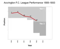 پس از اولین فصل حضور خود در لیگ لانکاشایر، آکرینگتون، در مرحله انتخاب مجدد برای لیگ فوتبال ناموفق بود.[2] اندکی بعد، آکرینگتون دچار مشکلات مالی شد که در نهایت منجر به نابودی آن شد. فعالیت این باشگاه در خارج از لیگ تا سال ۱۸۹۶ ادامه داشت، که سرانجام پس از شکست ۱۲–۰ در ۱۴ ژانویه برابر دارون در جام برتر لانکاشایر برچیده شد.