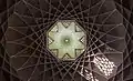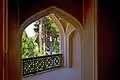 نمایی از داخل عمارت از پنجرهٔ پنجرهٔ اُرُسی مشبک با شیشههای رنگی