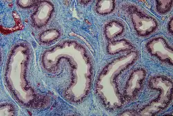 ![]() Section of اپیدیدیم. Connective tissue (blue) is seen supporting the بافت پوششی (purple) | |