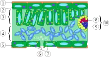 Schematic cross section of part of a leaf, xylem shown as red circles at figure 8