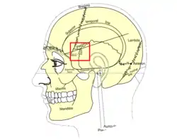 ![]() Side view of the skull with arrow pointing to the Pterion | |