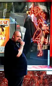![]() یک بانسر که در مقابل یک باشگاه استیرپ در سان فرانسیسکو ایستادهاست. | |