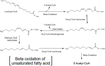 بیشتر اسیدهای چرب شرکتکننده در ساختار تری گلیسریدها از نوع اسیدهای چرب غیر اشباع با یک یا چند پیوند دوگانه میباشند که شکل ایزومری پیوند، CIS میباشند و بنابراین نمیتوانند توسط آنزیم انوئیل کوآ هیدراتاز تحت تأثیر قرار گیرند. دو آنزیم انوئیل کوآ ایرومراز و ۲و ۴ دی انوئیل کوآ ردوکتاز برای این مسیر علاوه بر آنزیمهای بتا اکسیداسیون اسیدهای چرب اشباع مورد نیاز است.