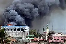 ![]() یک ساختمان در ماراوی که در اثر تیرباران نیروی هوایی فیلیپین آسیب دیدهاست | |||||||||