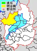 شهرستان تاکاشیما در سال ۱۸۹۰ با رنگ زرد مشخص شده است