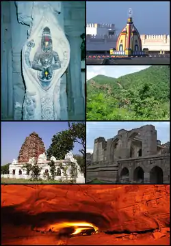 ![]() Clockwise from top: Raghavendra Swamy Temple at Mantralayam, Nallamala Hills, Ruined hall in Adoni fort, Belum Caves, Shivanandi temple, Statue of Narasimha at اهوبیلام | |