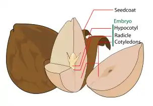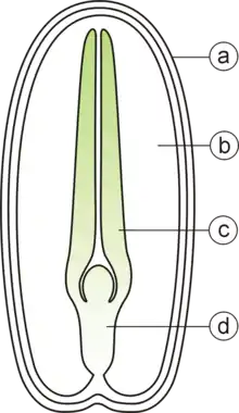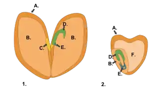 - ساقهچه (Epicotyl)، محور رویانی که بالای نقطه اتصال لپه (ها) است.
