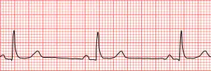 | در نوار الکتروکاردیوگرام، یک برادیکاردی سینوسی با ریتم قلبی (ضربان) ۵۰ بار در دقیقه مشاهده میشود. | |
