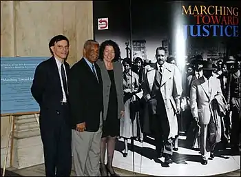 سه قاضی آمریکایی در جلوی پوستری بمناسبت بزرگداشت حکم براون در برابر هیأت آموزش و پرورش توپیکا ایستادهاند. نفر سمت راست سونیا سوتومایور است.