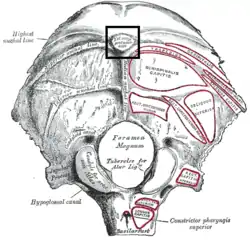 ![]() جمجمه lateral view. External occipital protuberance shown in red. | |