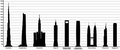 مقایسه برج زیفنگ (چهارمین از راست) با بلندترین سازههای آسیا