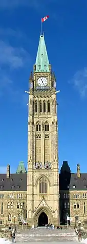 این برج در مسیر میانی بلوک مرکزی ساختمانهای پارلمان کانادا در اتاوا قرار دارد. این برج پس از آن ساخته شد که برج ۵۵-متری (۱۸۰ فوتی) ویکتوریا در سال ۱۹۱۶ طعمه آتش شد و به همراه آن بسیاری از بناهای بلوک مرکز نیز سوخت و تنها کتابخانه مجلس سالم ماند.