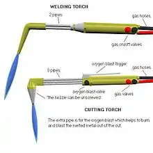 از سر مشعل جوشکاری برای جوشکاری فلزات استفاده میشود. با داشتن فقط یک یا دو لوله در حال حرکت به سمت نازل ، عدم ایجاد ماشه انفجار اکسیژن و دو دکمه سوپاپ در پایین دسته قابل شناسایی است و به اپراتور اجازه میدهد که به ترتیب جریان اکسیژن و سوخت را تنظیم کند.