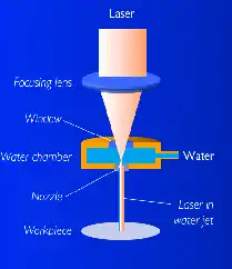 پرتو لیزر توسط لولهای هدایت میشود تا اینکه به اتاقک تحت فشار آب میرسد. طراحی لیزر و لوله به گونهای است که لیزر با انرژی زیاد را به واترجت میرساند. واترجتی که از لوله بیرون ریخته میشود، پرتو لیزر را با هدف بازتاب کامل آن پوشش میدهد، درست مانند فیبر نوری شیشهای معمولی؛ بنابراین میتوان واترجت را به عنوان شار هدایت نور با طول متغیر در نظر گرفت. به علت اینکه در این دستگاه از لیزر پالسی استفاده میشود، واتر جت که بهطور پیوسته در حال انجام کار است میتواند سریعاً سطح قطعه را خنک کند. نتیجه کار، برشی باریک، موازی، تمیز و بدون هیچ گونه آسیب دیدگی گرمایی است.