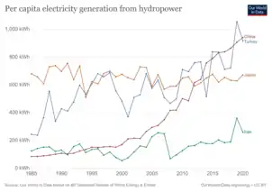 - «Per capita electricity generation from hydropower». Our World in Data. دریافتشده در ۲۰۲۱-۰۶-۰۴.