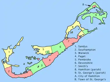برمودا دارای دو شهر عمده است: همیلتون (شهر) و سینتجُرج (شهرک)