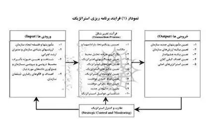 در مقاله «مبینی دهکردی و سلمانپور خویی» (۱۳۹۱)، مراحل برنامهریزی استراتژیک در قالب فرایند سه مرحلهای تعیین ورودیها، فرایند تغییر شکل ورودیها و در نهایت شکلگیری خروجی و مطابق با شکل زیر نشان داده شدهاست: