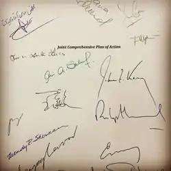 ![]() امضا کنندگان در حال اعلام پیمان موافقت. از راست به چپ جان کری، فیلیپ هموند، محمد جواد ظریف، فدریکا موگرینی، فرانک والتر اشتاینمایر، لوران فابیوس و وانگ یی پیش از قرائت توافق نهایی یا برنامه جامع اقدام مشترک | |