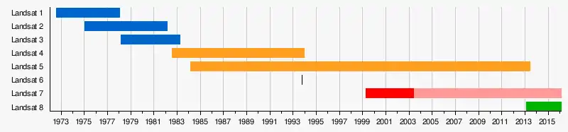 | لندست ۶ | ۵ اکتبر ۱۹۹۳ | ۵ اکتبر ۱۹۹۳ | ۰ روز | نتوانست در مدار قرار گیرد. لندست ۶ نسخه بهروزشده لندست ۵ بود که علاوه بر سنجنده MSS به سنجنده ETM نیز مجهز شده بود که امکان تهیه تصاویر با وضوح ۱۵ متر در باند تکرنگ را فراهم میساخت. | |